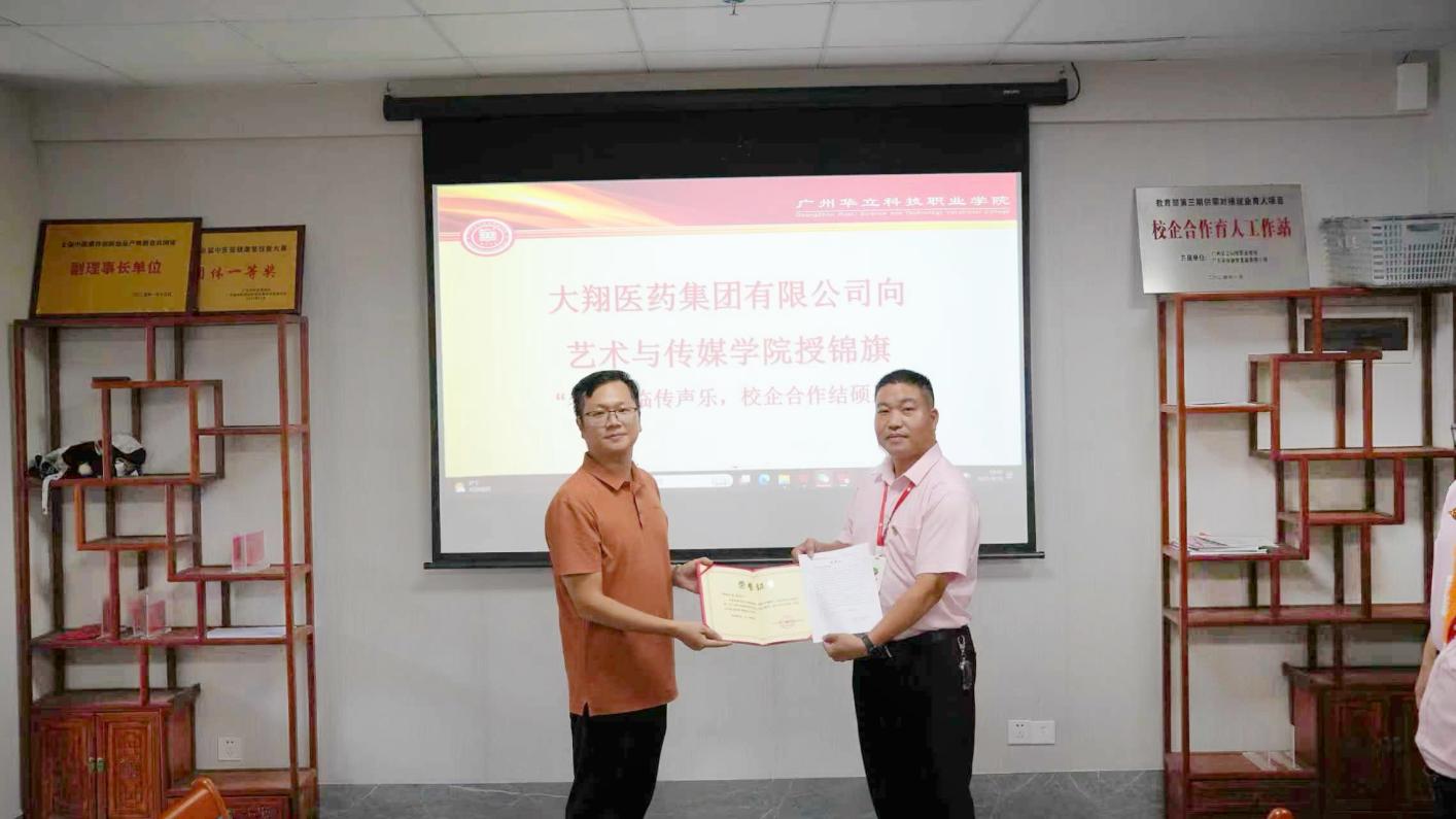 為表達(dá)誠摯謝意,大翔中藥向藝術(shù)與傳媒學(xué)院朱君院長頒發(fā)了榮譽證書,表彰其以卓越的藝術(shù)造詣和豐富經(jīng)驗,為大翔中藥企業(yè)文化建設(shè)增添光彩。同時,企業(yè)還向?qū)W院團(tuán)隊頒發(fā)了錦旗,以感謝師生團(tuán)隊在本次合作中的突出貢獻(xiàn)。