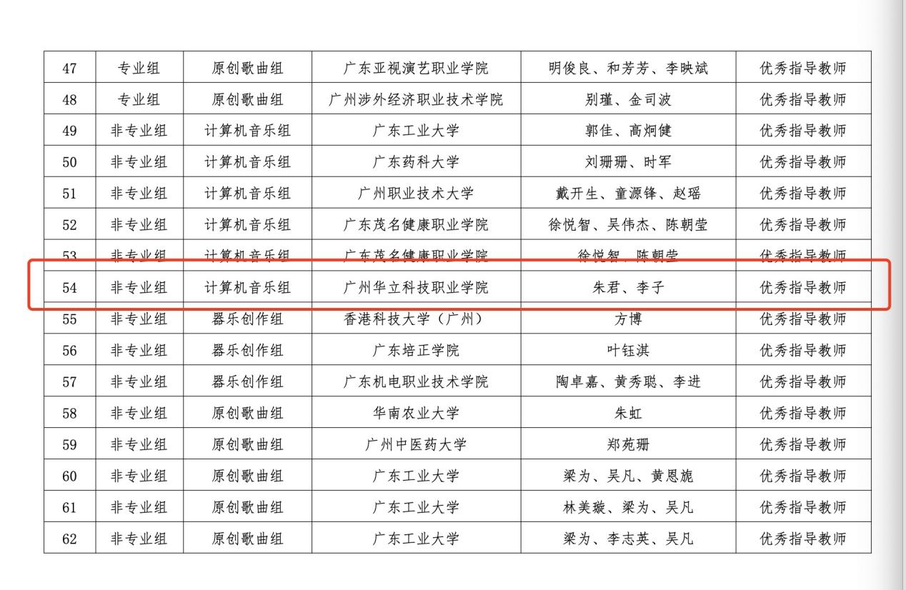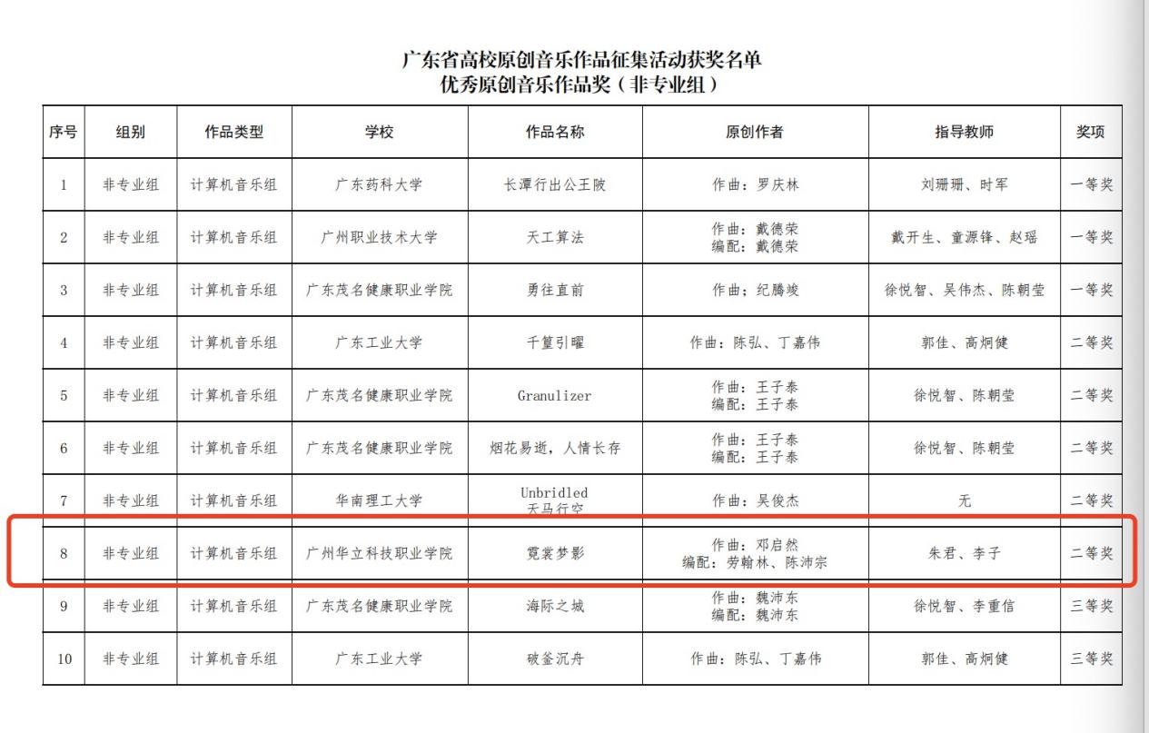 近日,廣東省高校原創(chuàng)音樂(lè)作品征集活動(dòng)評(píng)選結(jié)果公示完畢,我校選送的計(jì)算機(jī)音樂(lè)類作品《霓裳夢(mèng)影》在非專業(yè)組中表現(xiàn)亮眼,榮獲優(yōu)秀原創(chuàng)音樂(lè)作品二等獎(jiǎng);藝術(shù)與傳媒學(xué)院院長(zhǎng)朱君、教師李子同步斬獲 “優(yōu)秀指導(dǎo)教師” 稱號(hào)。