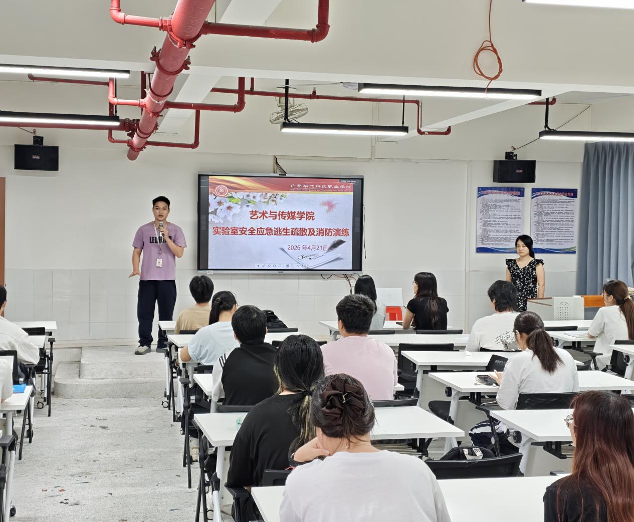 2026年4月21日下午,陽光輕柔地灑在西三401畫室實(shí)驗(yàn)室的墻上,為這間充滿藝術(shù)氣息的實(shí)驗(yàn)室披上了一層金色的紗衣。一場意義非凡的實(shí)驗(yàn)室安全消防演練活動正如火如荼地展開,宛如一幅緊張有序又扣人心弦的安全畫卷徐徐鋪展。此次演練由藝術(shù)與傳媒學(xué)院精心策劃組織,以“以練筑防強(qiáng)技能,以學(xué)踐安守匠心”為主題,旨在通過實(shí)戰(zhàn)演練強(qiáng)化師生的安全意識,提高應(yīng)急處置能力及自救能力,提升實(shí)驗(yàn)室的安全管理水平,構(gòu)建平安、和諧的實(shí)驗(yàn)室環(huán)境。