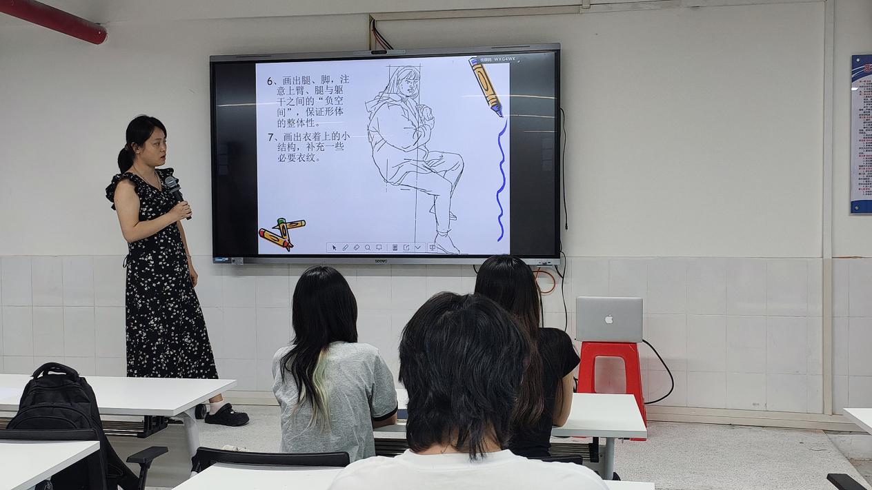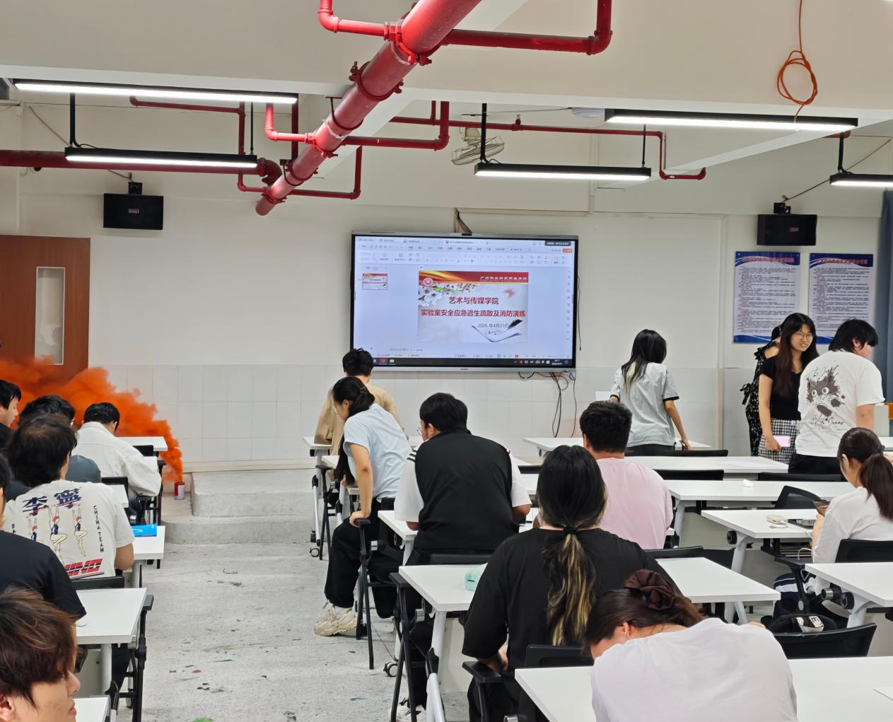 畫室內(nèi)正在進(jìn)行教學(xué),教學(xué)使用的設(shè)備比較多,因天氣炎熱,用電量大,教學(xué)電視外接電腦的電線設(shè)備發(fā)生短路了,在旁學(xué)生(學(xué)生甲)發(fā)現(xiàn)電線短路并冒煙,立即大聲報(bào)告:“老師,電線冒煙了!”,任課老師(姜兵)立即關(guān)閉實(shí)驗(yàn)室總電源開關(guān),并按下講臺上的“一鍵報(bào)警”按鈕,上報(bào)保衛(wèi)處,指揮學(xué)生保持冷靜,有序撤離實(shí)驗(yàn)室,并立刻通知學(xué)校安全管理人員處理等。整個(gè)疏散過程有條不紊,僅用了短短幾分鐘便全部完成,體現(xiàn)了師生們對演練流程的熟悉和良好的應(yīng)急反應(yīng)能力。