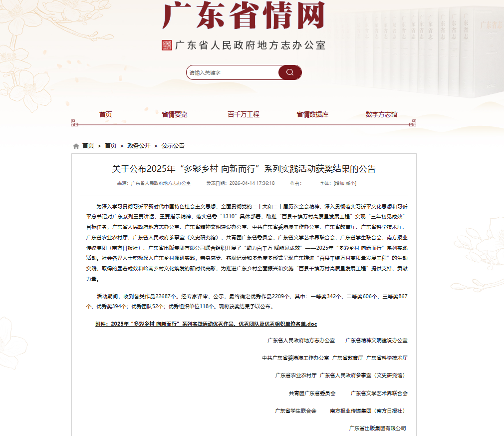 近日,由廣東省人民政府地方志辦公室等多部門聯(lián)合開展的2025年“多彩鄉(xiāng)村向新而行”系列實踐活動獲獎名單和2025年“多彩鄉(xiāng)村向新而行”系列實踐活動立項課題名單正式公布。我院高度重視、精心組織,師生踴躍參與、深耕創(chuàng)作,最終榮獲省級二等獎1項、三等獎1項,充分展現(xiàn)了藝傳學院的育人實力與青春風采!