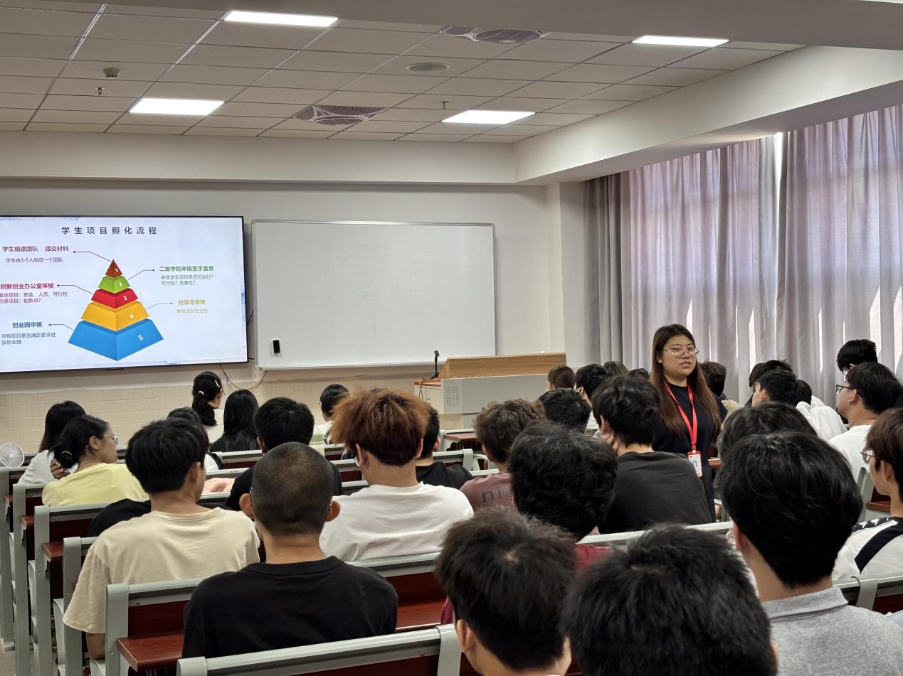 同時(shí),高老師還介紹了學(xué)校為支持學(xué)生創(chuàng)新創(chuàng)業(yè)所提供的各項(xiàng)資源和平臺(tái),如創(chuàng)業(yè)孵化基地、創(chuàng)新項(xiàng)目基金等,讓新生們感受到學(xué)院對(duì)雙創(chuàng)教育的重視和支持。為了助力新生的雙創(chuàng)想法從“萌芽”走向“結(jié)果”,學(xué)校構(gòu)建了全方位的支持體系。華立創(chuàng)新創(chuàng)業(yè)孵化基地作為核心載體,配備了1700平方米的多功能空間(涵蓋孵化區(qū)、培訓(xùn)區(qū)、會(huì)議區(qū)等),并組建了一支由35人組成的多元化導(dǎo)師團(tuán)(包括企業(yè)家、高校技術(shù)專(zhuān)家、金融機(jī)構(gòu)人士),通過(guò)線(xiàn)上線(xiàn)下相結(jié)合的方式提供個(gè)性化輔導(dǎo)。新生可組建3-5人團(tuán)隊(duì),按照“二級(jí)學(xué)院審核→雙創(chuàng)辦公室評(píng)估→校領(lǐng)導(dǎo)與創(chuàng)業(yè)園終審”的流程提交材料,入駐后享受全鏈條孵化服務(wù)。