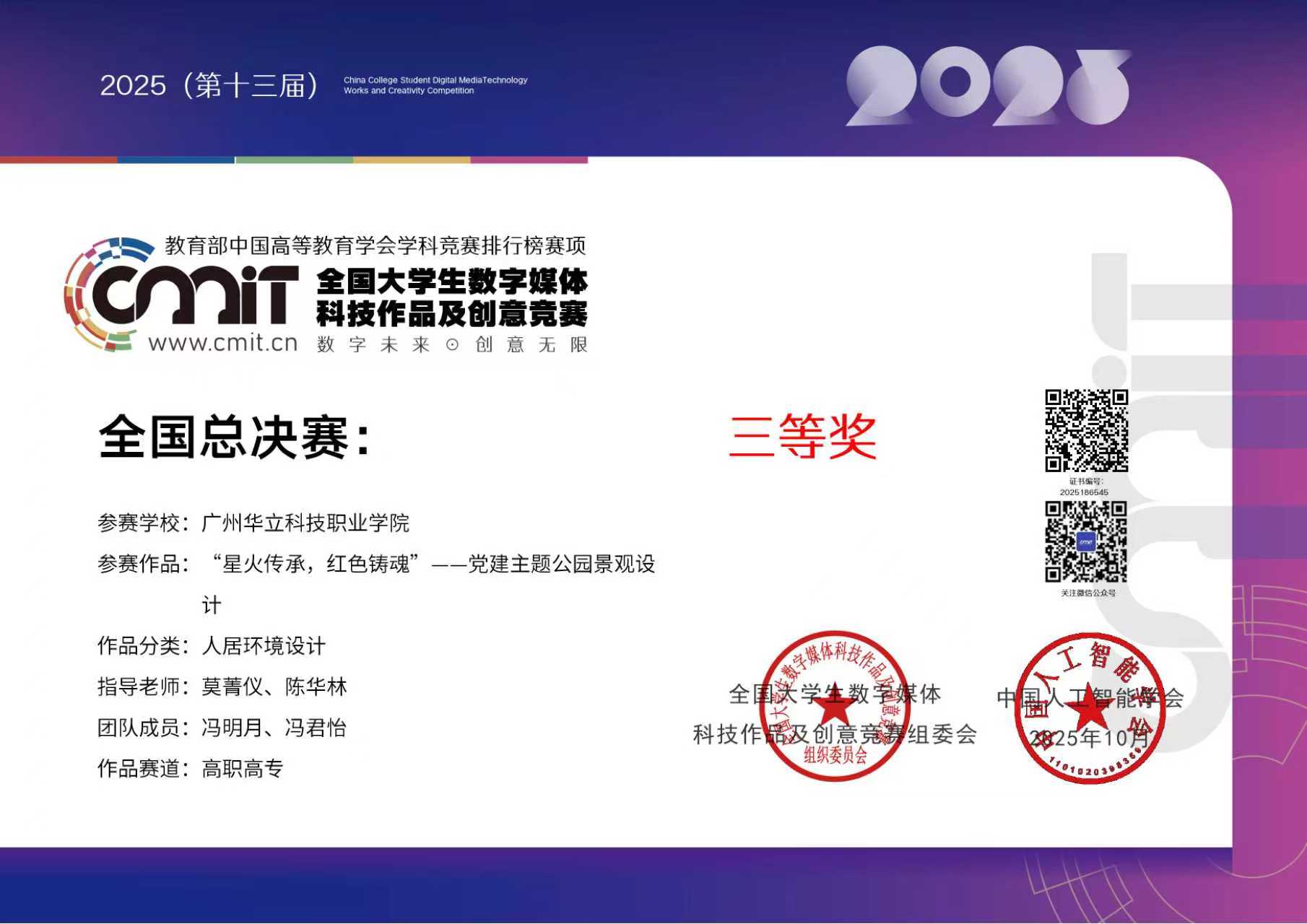 其中,由程若愚、莫菁儀、陳華林老師指導,陳佳怡、馮明月等同學完成的作品《嶼光別院-鄉(xiāng)村民宿設計》、《星火傳承,紅色鑄魂”--黨建主題公園景觀設計》在全國大學生數(shù)字媒體科技作品及創(chuàng)意競賽全國總決賽中榮獲三等獎2項,廣東賽區(qū)中獲二等獎2項;由田婭娟、莫菁儀、陳華林老師指導,何穎詩、馮君怡等同學完成作品《池上幽居靜寄山莊池上居復原與改造設計》、《“廬州軌跡”--道路節(jié)點綠化景觀工程恢復設計》榮獲廣東賽區(qū)三等獎2項。