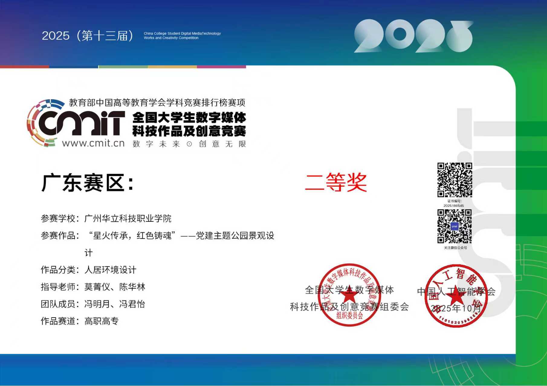 其中,由程若愚、莫菁儀、陳華林老師指導(dǎo),陳佳怡、馮明月等同學(xué)完成的作品《嶼光別院-鄉(xiāng)村民宿設(shè)計》、《星火傳承,紅色鑄魂”--黨建主題公園景觀設(shè)計》在全國大學(xué)生數(shù)字媒體科技作品及創(chuàng)意競賽全國總決賽中榮獲三等獎2項,廣東賽區(qū)中獲二等獎2項;由田婭娟、莫菁儀、陳華林老師指導(dǎo),何穎詩、馮君怡等同學(xué)完成作品《池上幽居靜寄山莊池上居復(fù)原與改造設(shè)計》、《“廬州軌跡”--道路節(jié)點綠化景觀工程恢復(fù)設(shè)計》榮獲廣東賽區(qū)三等獎2項。