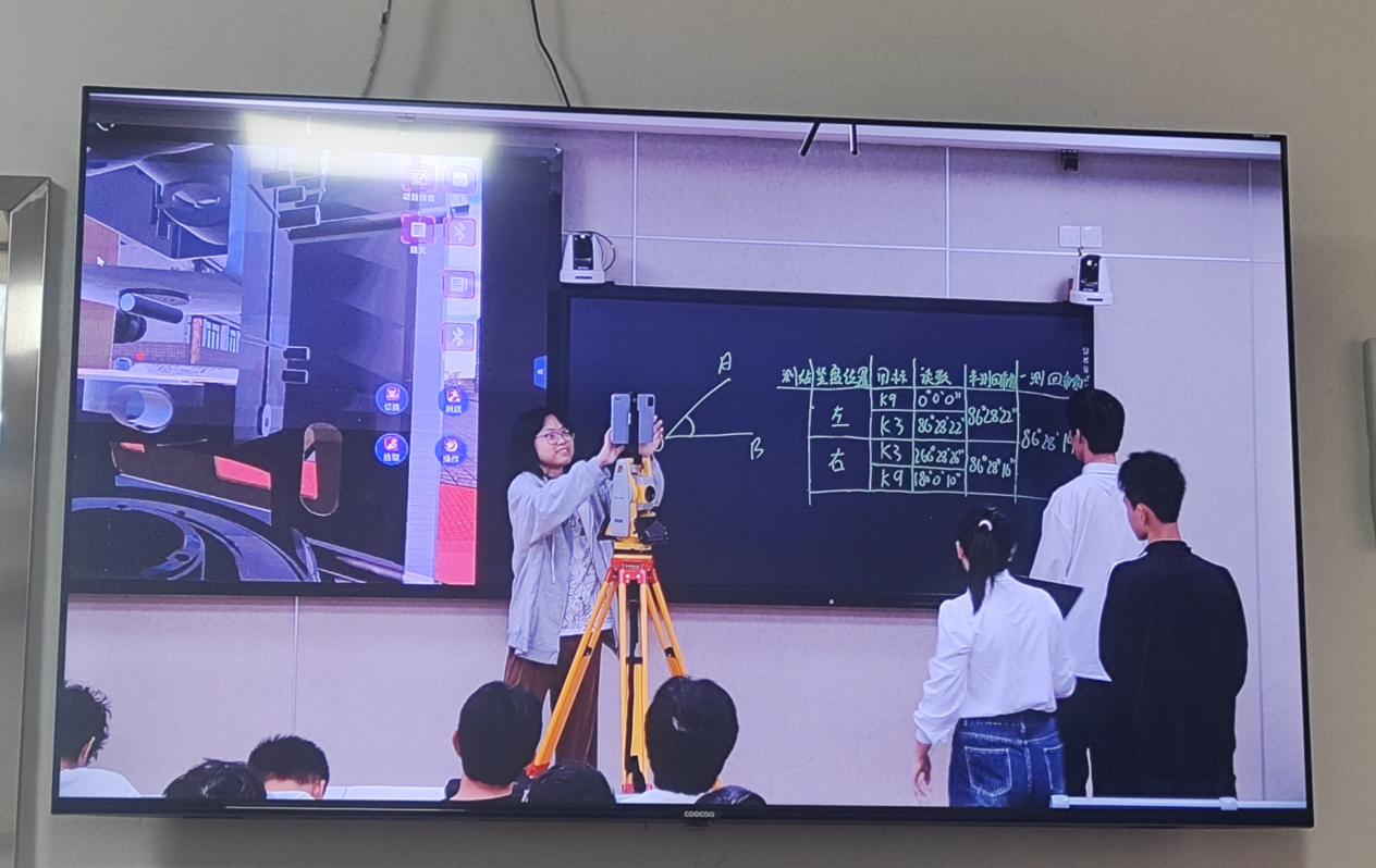 “測(cè)繪是工程建設(shè)的‘眼睛’,而全站儀就是這雙眼睛的核心工具?!闭n程伊始,賈相蘋老師簡潔明了地介紹了儀器的發(fā)展歷程、核心功能及在建筑、地質(zhì)、交通等領(lǐng)域的應(yīng)用場(chǎng)景。為打破傳統(tǒng)課堂“重理論、輕實(shí)踐”的局限,本次課程特別引入虛擬仿真系統(tǒng)——虛實(shí)一體云協(xié)同虛擬仿真平臺(tái),通過構(gòu)建沉浸式測(cè)繪作業(yè)環(huán)境,學(xué)生們仿佛置身現(xiàn)場(chǎng)。教師結(jié)合虛擬仿真平臺(tái),將抽象的 “大地坐標(biāo)系”“高程測(cè)量” 等理論知識(shí)轉(zhuǎn)化為可視化的動(dòng)態(tài)畫面,原本晦澀的公式推導(dǎo)、原理闡釋,通過與真實(shí)工程案例的結(jié)合,變得清晰易懂?,F(xiàn)場(chǎng)學(xué)生不時(shí)舉手提問,教師則借助交互屏幕實(shí)時(shí)標(biāo)注、拆解關(guān)鍵環(huán)節(jié),讓理論學(xué)習(xí)不再 “紙上談兵”。