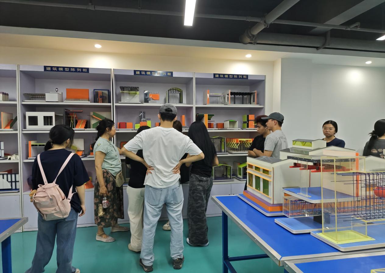 工地實(shí)訓(xùn)結(jié)束后,師生前往實(shí)訓(xùn)室參觀,通過實(shí)物模型進(jìn)一步認(rèn)識建筑材料特性與應(yīng)用場景,深化專業(yè)認(rèn)知。