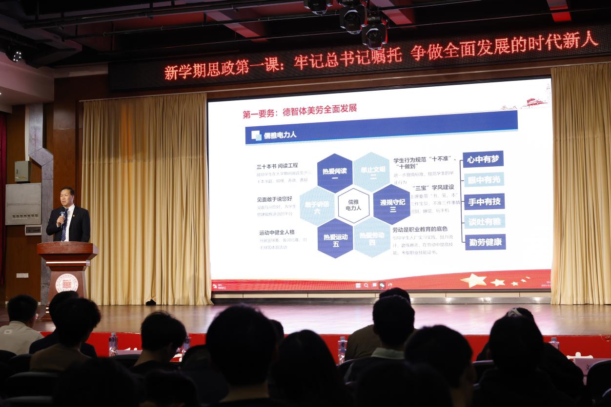 接著他分別對“四個(gè)第一”進(jìn)行了詳細(xì)地講解,重點(diǎn)講解了學(xué)院開展的“儒雅電力人”文化創(chuàng)建活動(dòng)的意義,號(hào)召同學(xué)們新學(xué)期開始,要懷抱夢想又腳踏實(shí)地,敢想敢為又善作善成,以“四個(gè)第一”為基礎(chǔ),立志做有理想、敢擔(dān)當(dāng)、能吃苦、肯奮斗的新時(shí)代好青年,讓青春在全面建設(shè)社會(huì)主義現(xiàn)代化國家的火熱實(shí)踐中綻放絢麗之花。