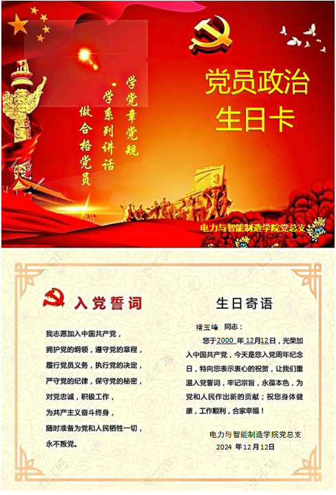 作為電力與智能制造學(xué)院的黨總支書記褚玉峰,12月12日早上我收到了學(xué)院黨組織發(fā)來的“政治生日”賀卡,心情特別興奮,24年前自己面對黨旗,舉起右手入黨宣誓的畫面立即浮現(xiàn)在了眼前,鏗鏘有力的誓言,使我今天干工作特別來勁。