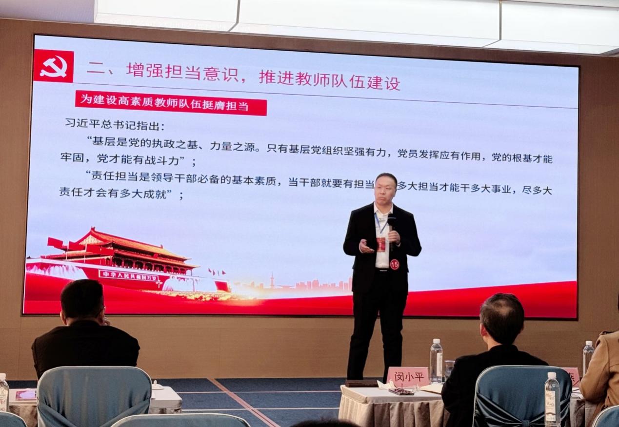 本次比賽分為初賽和決賽兩個環(huán)節(jié),初賽內(nèi)容包括線上黨務知識測試、微黨課比賽兩項,決賽內(nèi)容包括創(chuàng)新案例展示、現(xiàn)場答題兩項。在微黨課比賽環(huán)節(jié),褚玉峰以《以高度政治擔當建設好高素質(zhì)教師隊伍為推進中國式現(xiàn)代化貢獻力量》為題,結合黨的二十屆三中全會精神、全國教育大會精神和習近平總書記關于基層黨組織建設的重要論述,倡議基層黨組織書記應在建設高素質(zhì)教師隊伍中擔當使命;在創(chuàng)新案例分享環(huán)節(jié),褚玉峰分享我校電力與智能制造學院黨總支以“123456”黨建創(chuàng)優(yōu)工程,推進“一融雙高”的創(chuàng)新案例。