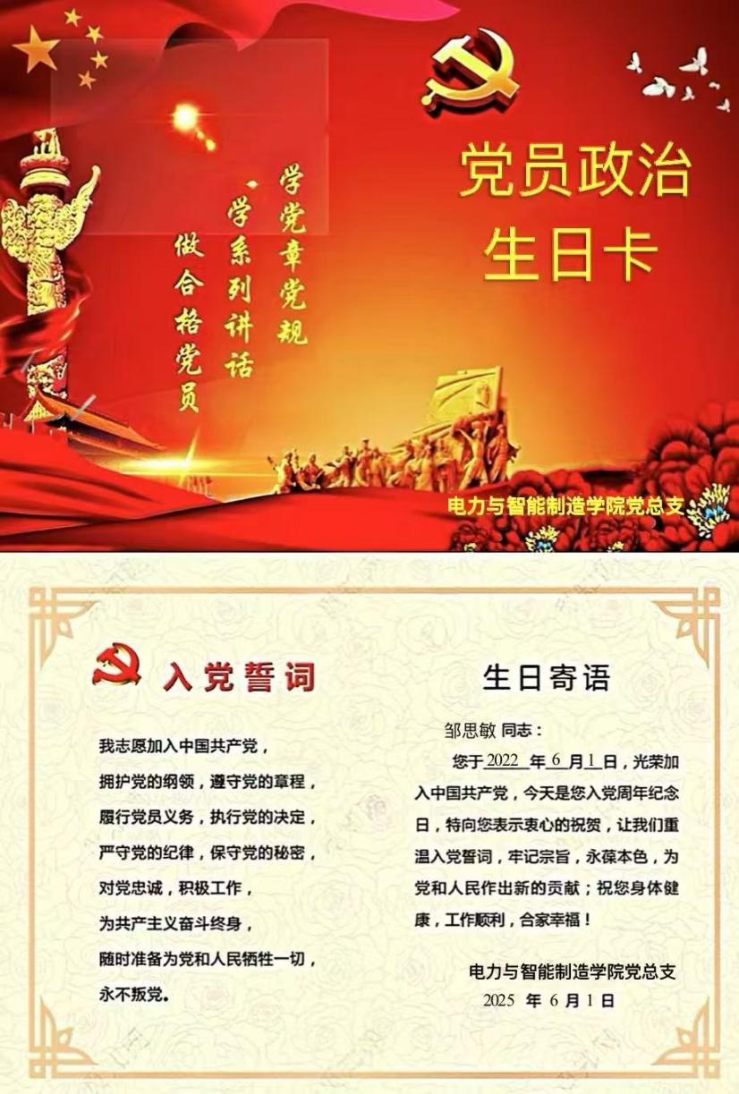 作為電力與智能制造學(xué)院黨總支教師黨支部的一名教師黨員鄒思敏,6月1日早上,收到了學(xué)院黨組織的發(fā)“政治生日”賀卡,心情特別興奮,2021年6月1日是我加入中國共產(chǎn)黨的日子。