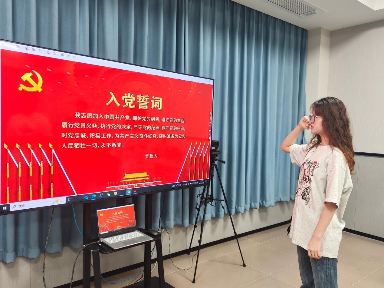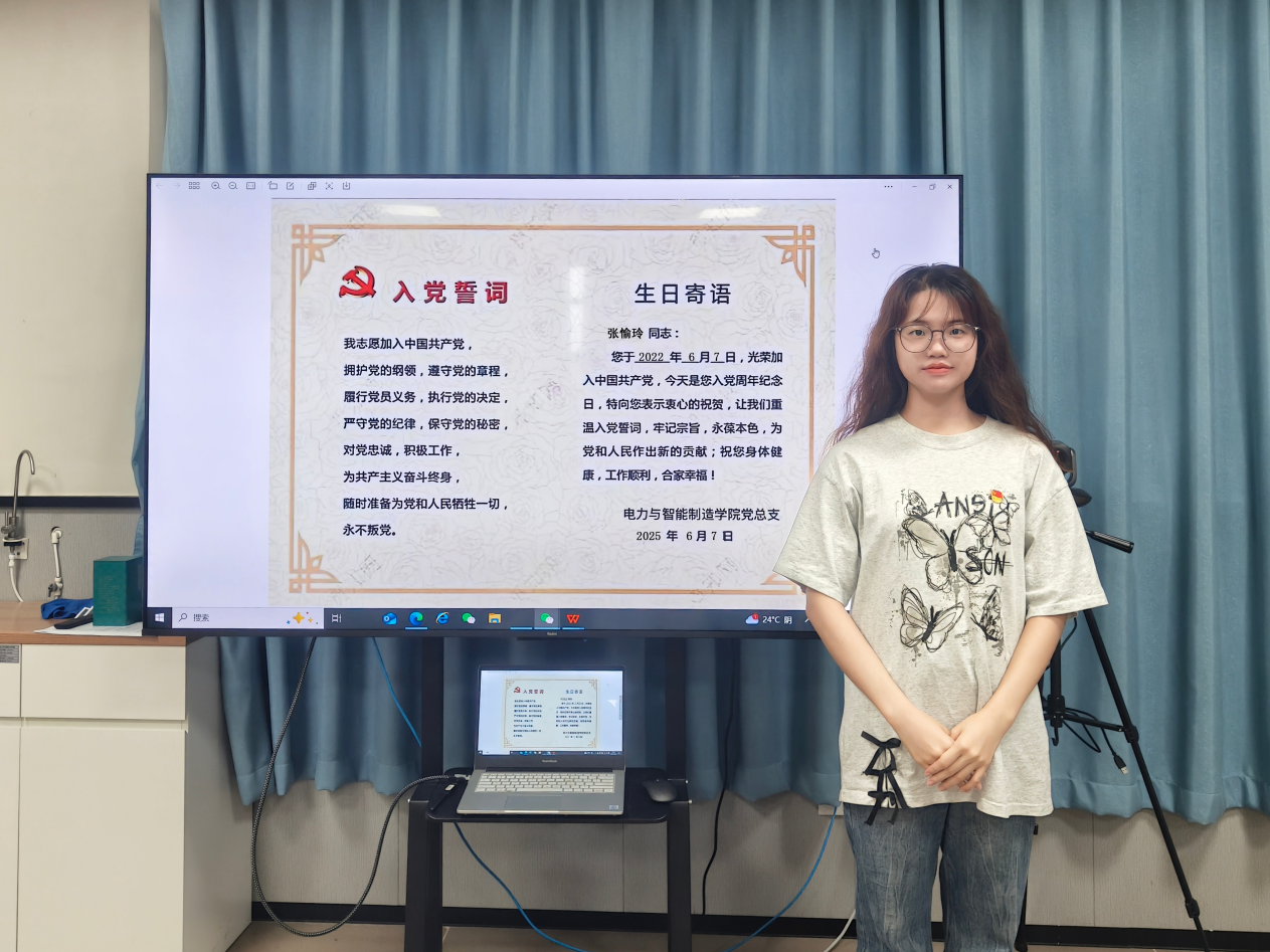 6月7日,電力與智能制造學院的黨員教師張愉玲收到了學院黨組織發(fā)的“政治生日”賀卡。一場莊重且意義非凡的政治生日活動在學校會議室舉行?;顒釉谇f嚴的氛圍中拉開帷幕,張愉玲同志面向鮮艷的黨旗,舉起右拳,重溫入黨誓詞。每一個字都擲地有聲,每一句誓言都飽含著對黨的忠誠和為黨的事業(yè)奮斗終身的決心。這不僅是對入黨初心的重溫,更是對未來行動的承諾,激勵著黨員們時刻以高標準嚴格要求自己,在工作和生活中發(fā)揮先鋒模范作用。