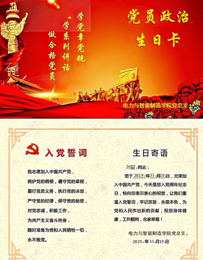 作為電力與智能制造學(xué)院的一名黨員教師劉留,11月19日,在收到學(xué)院黨組織發(fā)來(lái)的“政治生日”賀卡,我的心情特別興奮,政治生日是表達(dá)自己對(duì)黨的忠誠(chéng)和堅(jiān)定信仰的重要時(shí)刻,在這個(gè)特殊的日子里,對(duì)黨的忠誠(chéng)信仰得到了再次強(qiáng)化。