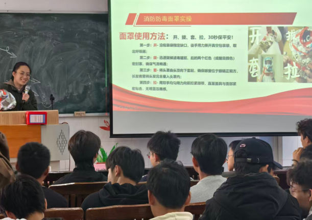 培訓中,實訓室管理員陳曉欣老師結(jié)合實訓室日常管理實例,詳細解讀了儀器設備操作規(guī)程,實訓室安全管理須知,重點強調(diào)了消防安全“預防為先、防消結(jié)合”的基本原則。針對實訓室可能出現(xiàn)的電氣設備故障火災等突發(fā)情況,管理員現(xiàn)場演示了防毒面具的正確佩戴步驟,講解了滅火器的使用方法,逐一拆解操作要點,每位來講座的班級代表成為班級安全知識的“傳播員”。