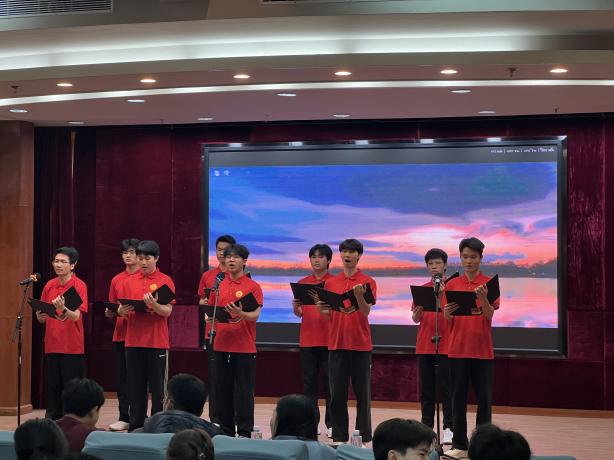 隨后,比賽在熱烈氛圍中正式開始,各參賽隊伍依次登臺,深情誦讀了《共產(chǎn)黨宣言》、《祖國啊,我親愛的祖國》、《萬疆》、《以電為炬,赴信仰之約》、《“十五五”新程,青春作答》等富有時代氣息的時代新篇。其中,紅色基因傳承隊演繹的《共產(chǎn)黨宣言》選段鏗鏘有力、氣勢恢宏,以“全世界無產(chǎn)者,聯(lián)合起來”為代表的激昂詞句,如星火燎原,瞬間點燃全場熱情,將比賽推向高潮。各個參賽隊伍情緒飽滿、儀態(tài)莊重,借助多媒體手段,融圖文、音樂與朗誦于一體,為現(xiàn)場觀眾呈現(xiàn)了一場沉浸式、感染力的視聽盛宴,完成了一次深刻的精神洗禮。