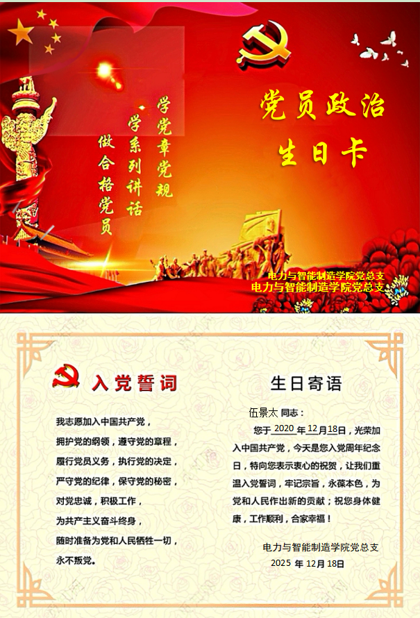 作為電力與智能制造學(xué)院的一名輔導(dǎo)員伍景太,2025年12月18日,我收到了黨組織發(fā)來的“政治生日”賀卡。五年前的今天,我光榮地加入了中國(guó)共產(chǎn)黨。五年后的今天我收到了一份來自黨組織的特別禮物——“黨員政治生日賀卡”。這張賀卡承載著組織對(duì)我的深切關(guān)懷與殷切期許。