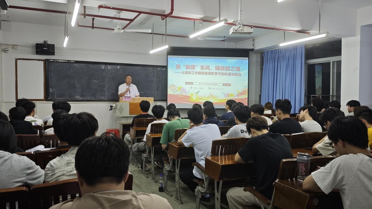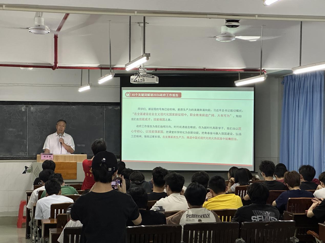 為深入學(xué)習(xí)貫徹2026年全國(guó)兩會(huì)精神,幫助我院學(xué)子找準(zhǔn)時(shí)代定位、明確技能成才方向,3月25日,電力與智能制造學(xué)院在西一403課室開展春季學(xué)期“思政第一課”專題學(xué)習(xí)。學(xué)院黨總支書記褚玉峰以《乘“新質(zhì)”東風(fēng),鑄技能之魂——從政府工作報(bào)告看高職學(xué)子的機(jī)遇與擔(dān)當(dāng)》為主題,為同學(xué)們講授思政第一課。