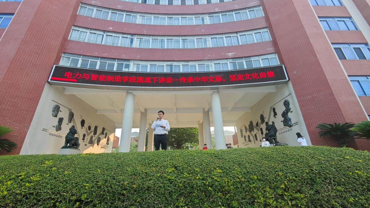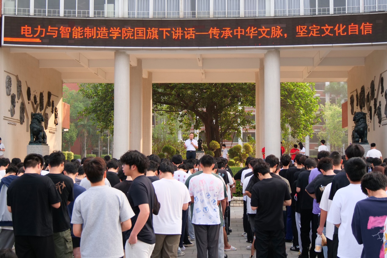 升國(guó)旗儀式結(jié)束后,學(xué)院黨總支書(shū)記褚玉峰作國(guó)旗下講話。他講到,中華優(yōu)秀傳統(tǒng)文化是中華民族的文化根脈,其蘊(yùn)含的思想觀念、人文精神、道德規(guī)范,是我們中國(guó)人思想和精神的內(nèi)核。文化是一個(gè)國(guó)家、一個(gè)民族的靈魂,文化自信是更基礎(chǔ)、更廣泛、更深厚的自信,是一個(gè)國(guó)家、一個(gè)民族發(fā)展中最基本、最深沉、最持久的力量。電力與智能制造學(xué)院是一個(gè)有文化的學(xué)院,2023年開(kāi)創(chuàng)了“儒雅電力人”文化育人黨建品牌,將中華優(yōu)秀傳統(tǒng)文化、革命文化、社會(huì)主義先進(jìn)文化有機(jī)融合到六個(gè)習(xí)慣的養(yǎng)成中。堅(jiān)持以文育人、以文化人,努力把每位同學(xué)都培養(yǎng)成心中有夢(mèng)、眼中有光、手中有技、談吐有雅、勤勞健康的電力人。希望同學(xué)們積極行動(dòng)起來(lái),共同參與到學(xué)院的儒雅文化創(chuàng)建中,人人爭(zhēng)做“儒雅電力人”。最后,希望同學(xué)們牢記習(xí)近平總書(shū)記囑托,堅(jiān)定不移聽(tīng)黨話、跟黨走,爭(zhēng)做有理想、敢擔(dān)當(dāng)、能吃苦、肯奮斗的新時(shí)代好青年,以中華文脈滋養(yǎng)初心,以文化自信照亮前路。把“儒雅”之風(fēng)刻進(jìn)行動(dòng),把工匠之心融入技能,把文化傳承化作愛(ài)國(guó)實(shí)踐,為中華民族偉大復(fù)興貢獻(xiàn)青春力量。