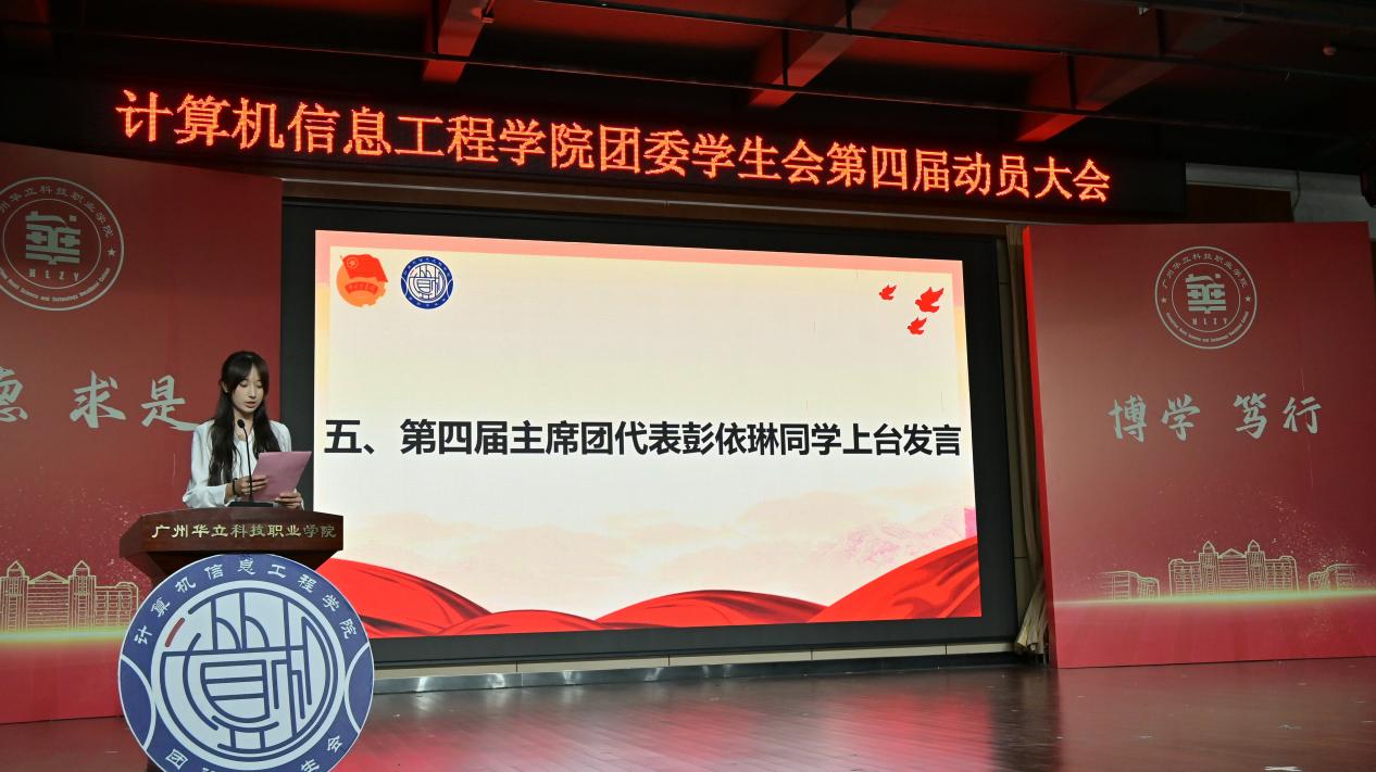 緊接著第四屆主席團(tuán)代表彭依琳同學(xué)上臺(tái)發(fā)言。她表達(dá)了對(duì)學(xué)院領(lǐng)導(dǎo)、老師及同學(xué)們信任的感謝,并闡述了新一屆學(xué)生會(huì)的工作思路與堅(jiān)定決心,承諾將帶領(lǐng)全體成員精誠(chéng)協(xié)作,開(kāi)拓創(chuàng)新。