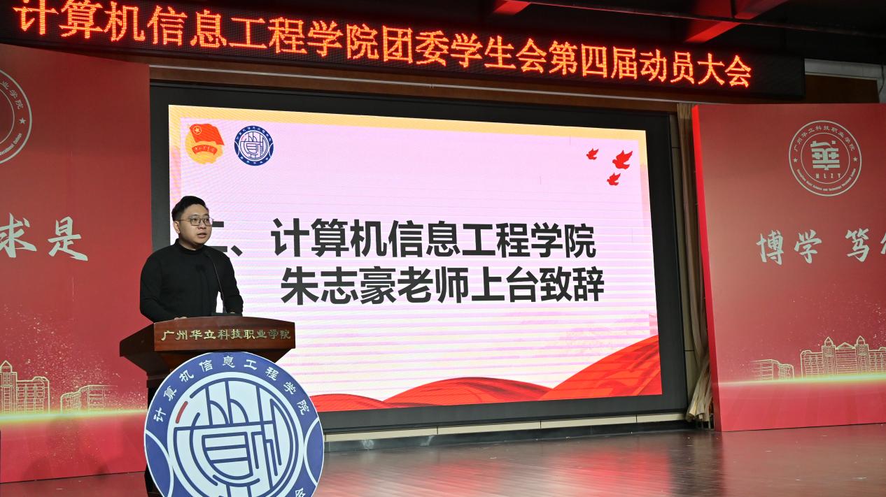 計(jì)算機(jī)信息工程學(xué)院黨總支專職副書(shū)記兼學(xué)管主任朱志豪老師上臺(tái)致辭。朱老師對(duì)第三屆學(xué)生會(huì)成員的辛勤付出表示肯定,并對(duì)新一屆學(xué)生會(huì)的成立表示熱烈祝賀。他勉勵(lì)全體成員要明確責(zé)任擔(dān)當(dāng),錘煉服務(wù)本領(lǐng),在未來(lái)的工作中積極進(jìn)取,為學(xué)院發(fā)展貢獻(xiàn)青春力量。