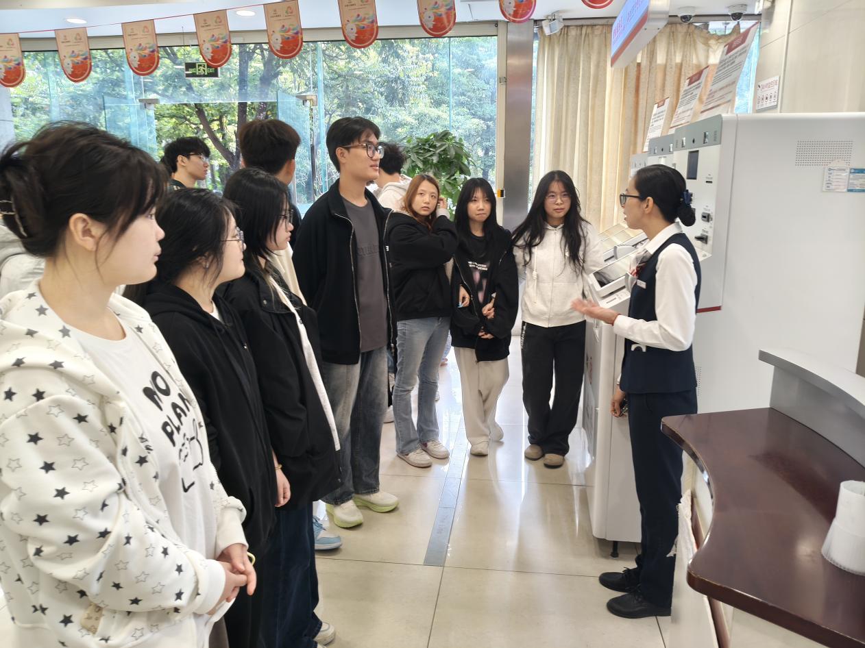 在工行增城增江支行石麗金經(jīng)理的帶領(lǐng)下,師生先后參觀了營業(yè)大廳、自助服務(wù)區(qū)和理財咨詢區(qū)。在營業(yè)大廳,講解人員細致拆解了叫號系統(tǒng)的運作邏輯、現(xiàn)金與非現(xiàn)金業(yè)務(wù)窗口的分工差異,以及從客戶接待到業(yè)務(wù)辦結(jié)的全流程規(guī)范;在自助服務(wù)區(qū),通過現(xiàn)場演示,生動講解了ATM機、自助終端等設(shè)備的操作方法與安全使用要點;在理財咨詢區(qū),圍繞理財產(chǎn)品分類、風險等級評估及客戶服務(wù)標準等內(nèi)容展開詳細介紹,幫助學生建立對銀行業(yè)務(wù)體系的系統(tǒng)認知。