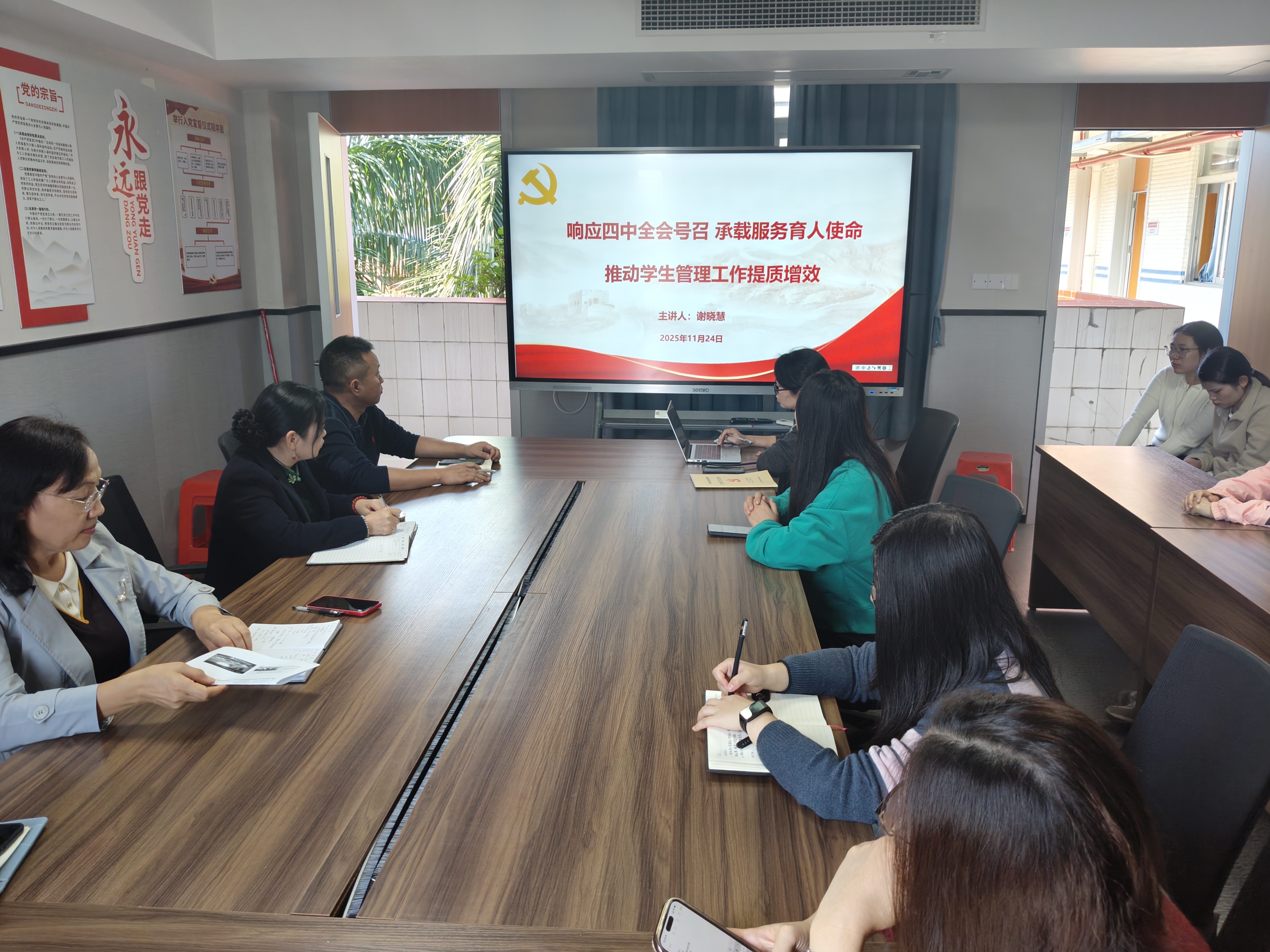 其次,黨總支專職副書記謝曉慧同志以“響應(yīng)四中全會(huì)號(hào)召 承載服務(wù)育人使命”為題,指出學(xué)生管理工作需踐行“以學(xué)生為中心”理念,優(yōu)化事務(wù)流程,完善心理健康與就業(yè)指導(dǎo)體系,打造“一站式”學(xué)生社區(qū)和“智慧學(xué)工”平臺(tái),推動(dòng)管理服務(wù)向育人服務(wù)轉(zhuǎn)型。