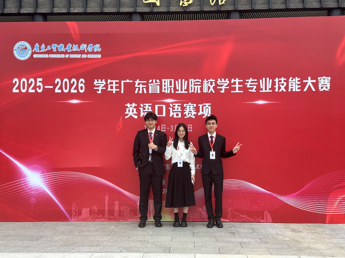 3月15日至16日,由廣東省教育廳主辦的2025-2026年度廣東省職業(yè)院校技能大賽(高職組)英語口語賽項圓滿落幕。本次大賽匯聚全省87所高職院校320余名選手同臺競技,賽制設置 “職場描述”“情景交流”及“綜合展示”等模塊,全面考查選手英語應用能力與團隊協(xié)作素養(yǎng)。經過兩天激烈角逐,我校云浮校區(qū)經管學院劉有為、袁靖宜、吳宇峰(圖1)三名同學憑借扎實的語言功底和穩(wěn)定的臨場發(fā)揮,榮獲團體三等獎。