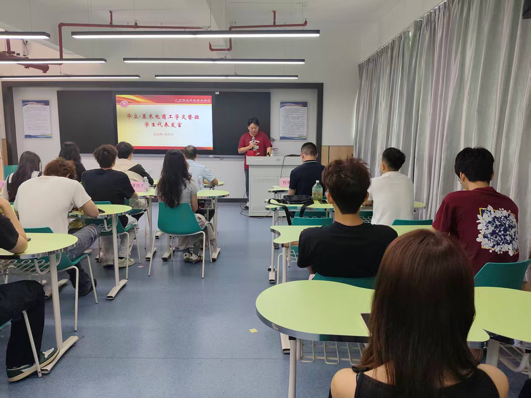 出席本次開班儀式的有廣州華立科技職業(yè)學(xué)院經(jīng)濟(jì)管理學(xué)院院長(zhǎng)劉惠玲、教學(xué)主任冷長(zhǎng)恒、電商系主任程愛洪,校內(nèi)指導(dǎo)老師劉淑琴、班主任付志偉;萊米公司總經(jīng)理王闖、公司指導(dǎo)老師蕭俊杰、溫麗娟,以及參與工學(xué)交替的22名學(xué)生。儀式由程愛洪主任主持。
