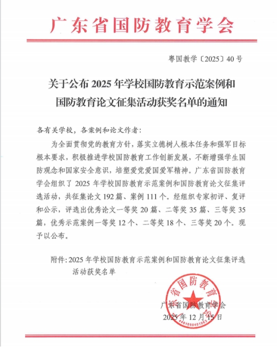 近日,我校思政課教師參加由廣東省國防教育學(xué)會組織的2025年學(xué)校國防教育示范案例和國防教育論文征集評選活動并獲得榮譽。其中羅冰女、陳勝軍、黃冠霖等老師獲示范案例一等獎,何相寧老師獲優(yōu)秀論文二等獎。