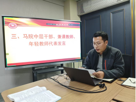 隨后,馬克思主義學(xué)院行政人事負(fù)責(zé)人李權(quán)、任課教師張卓婭、青年教師焦揚(yáng)、王繼東分別以不同身份代表發(fā)言表態(tài)。大家表示要嚴(yán)格落實(shí)學(xué)院各項(xiàng)決策部署,深耕思政課堂教學(xué),聚焦科研能力提升,積極參與各類思政科研項(xiàng)目申報(bào),嚴(yán)把意識(shí)形態(tài)關(guān),努力完成各自崗位職責(zé)。