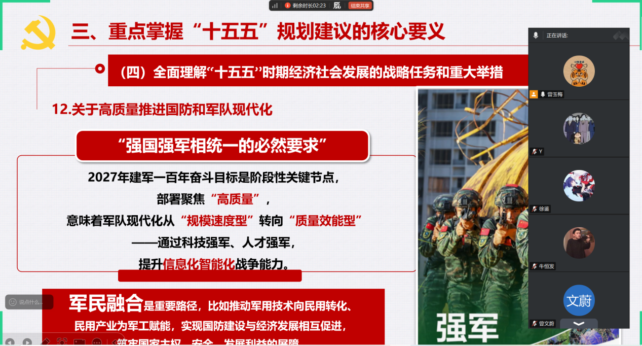 學(xué)院充分發(fā)揮輔導(dǎo)員隊伍宣講主力作用,15名輔導(dǎo)員組建專項宣講小組,緊扣“黨的二十屆四中全會精神”“中國式現(xiàn)代化發(fā)展”核心主題,結(jié)合中醫(yī)藥事業(yè)發(fā)展使命與青年成長擔(dān)當(dāng)精心備課,以主題班會為主要載體,創(chuàng)新采用“線上+線下”融合宣講模式,實(shí)現(xiàn)理論學(xué)習(xí)全覆蓋。線下課堂上,輔導(dǎo)員們以“小切口解讀大戰(zhàn)略”,結(jié)合行業(yè)發(fā)展案例闡釋全會精神內(nèi)涵,引導(dǎo)學(xué)生立足專業(yè)找準(zhǔn)成長坐標(biāo);線上會議里,針對在外實(shí)習(xí)學(xué)生的學(xué)習(xí)需求優(yōu)化宣講形式,通過實(shí)時互動、資料推送等方式,讓實(shí)習(xí)學(xué)子隨時隨地參與學(xué)習(xí),確保宣講無死角、精神傳到位。此次系列活動累計覆蓋學(xué)生近2900人,切實(shí)推動黨的二十屆四中全會精神走進(jìn)每位學(xué)子心中。