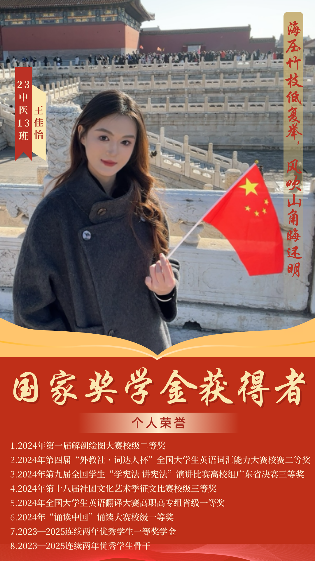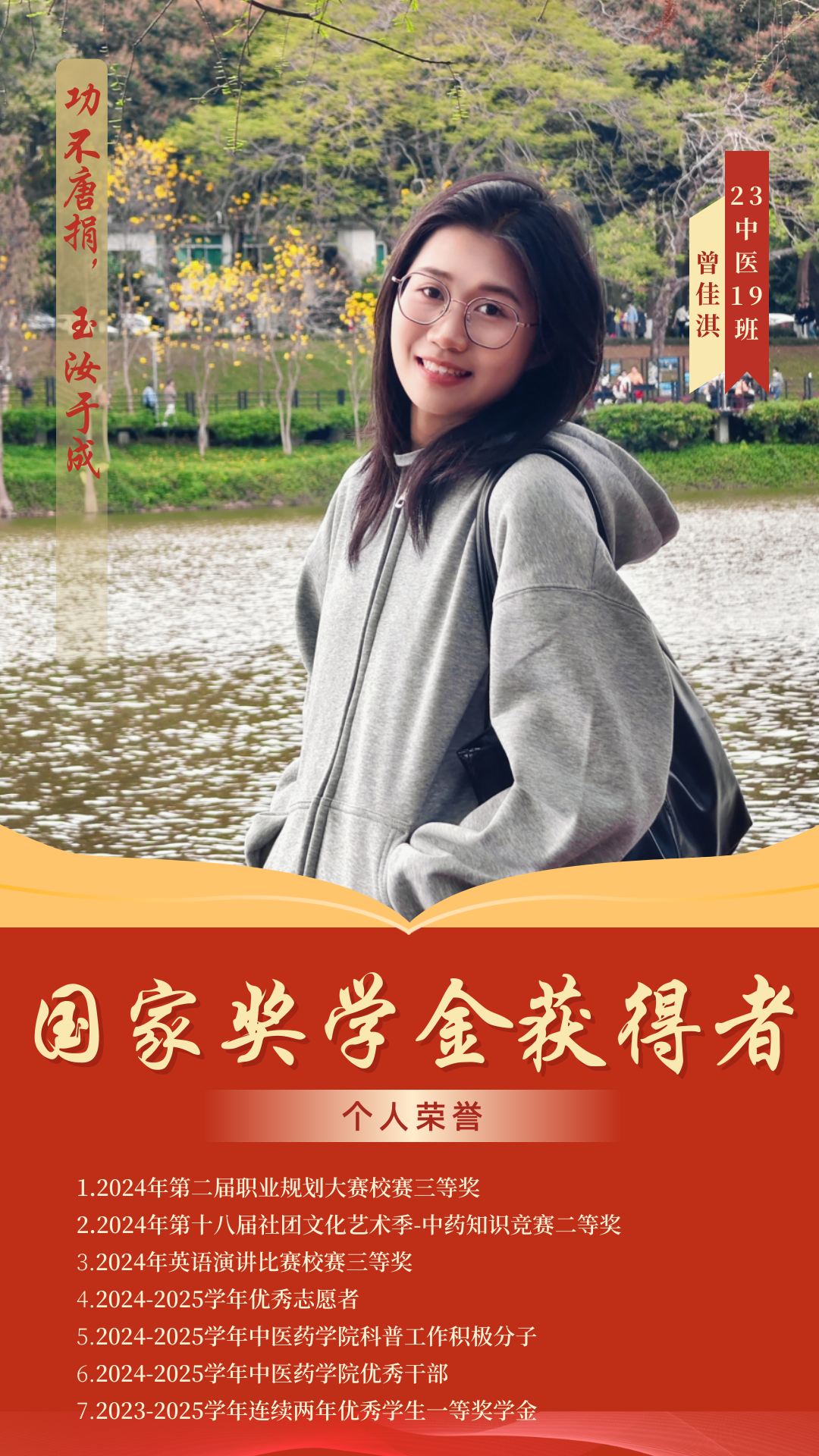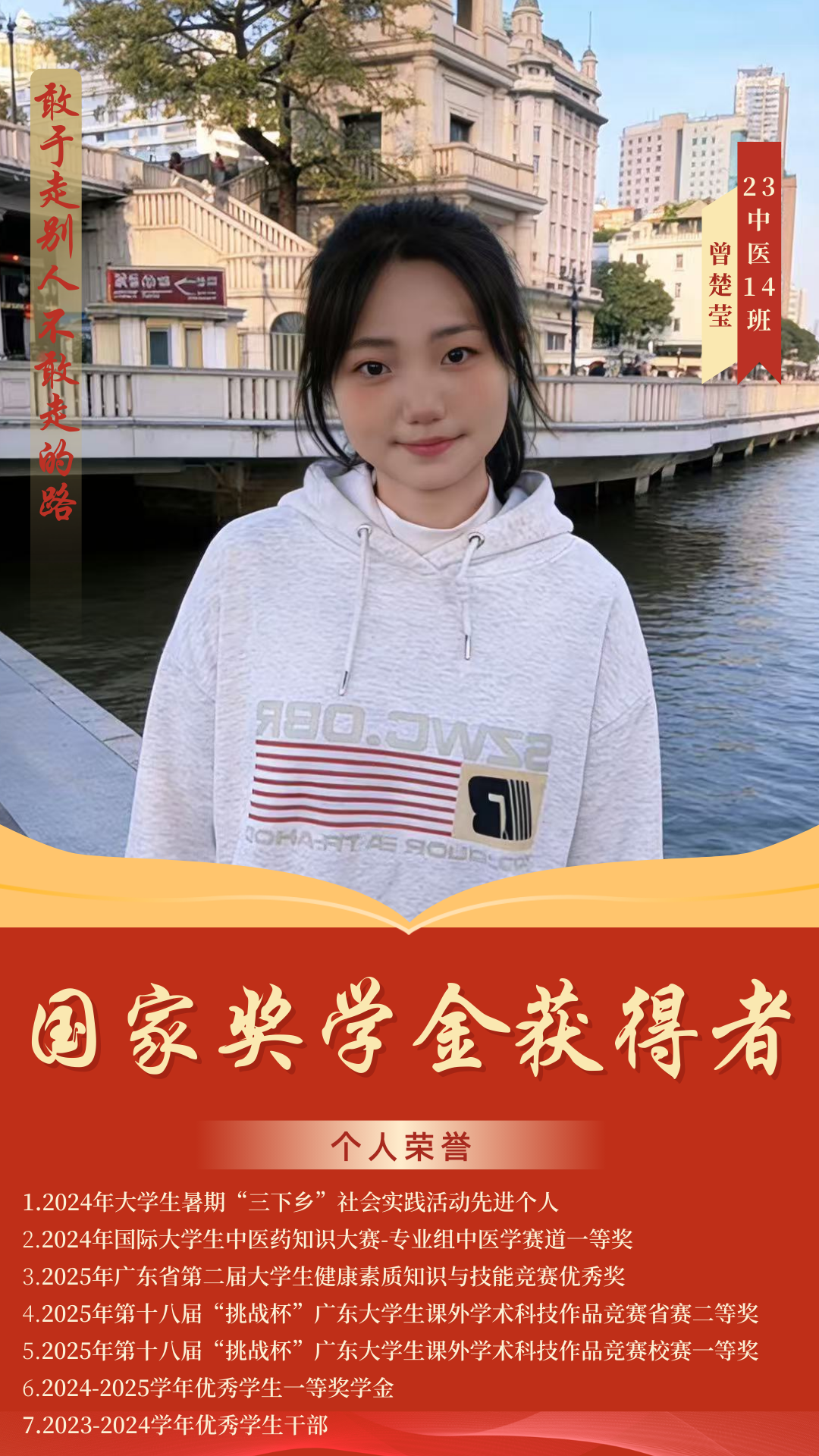 杏林綻芳華,巾幗競(jìng)風(fēng)流。在2024-2025學(xué)年國(guó)家獎(jiǎng)學(xué)金評(píng)選中,我院四名優(yōu)秀學(xué)子憑借扎實(shí)的專業(yè)素養(yǎng)、勤勉的治學(xué)態(tài)度和卓越的綜合表現(xiàn)脫穎而出,成功斬獲國(guó)家獎(jiǎng)學(xué)金,用青春實(shí)績(jī)?cè)忈屃酥嗅t(yī)藥學(xué)子篤學(xué)求真、礪行致遠(yuǎn)的優(yōu)良風(fēng)貌。榜樣力量催人奮進(jìn),青春風(fēng)采薪火相傳。今天,讓我們一同走近這四位優(yōu)秀的巾幗學(xué)子,聆聽她們深耕杏林、逐夢(mèng)前行的奮斗故事,汲取榜樣力量,感悟青春擔(dān)當(dāng),在傳承中醫(yī)藥薪火的道路上攜手奮進(jìn)、共譜華章。