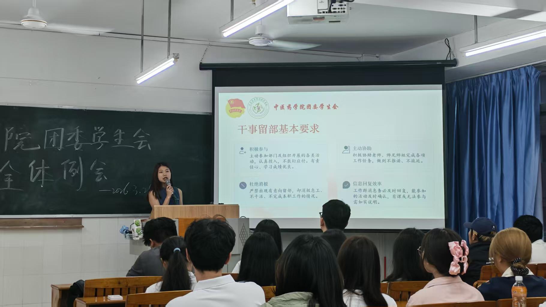 2026年3月24日,中醫(yī)藥學(xué)院團(tuán)委學(xué)生會(huì)學(xué)期工作部署會(huì)在西二201教室順利召開。本次會(huì)議主要講解干事留部競選、干部學(xué)期工作例會(huì)兩大核心議題,進(jìn)一步明確工作要求,強(qiáng)化干部隊(duì)伍紀(jì)律意識(shí)與服務(wù)初心,為學(xué)院團(tuán)學(xué)工作高質(zhì)量發(fā)展奠定基礎(chǔ)。中醫(yī)藥學(xué)院團(tuán)委書記謝梓婷老師出席會(huì)議并講話,全體學(xué)生會(huì)成員參會(huì)。