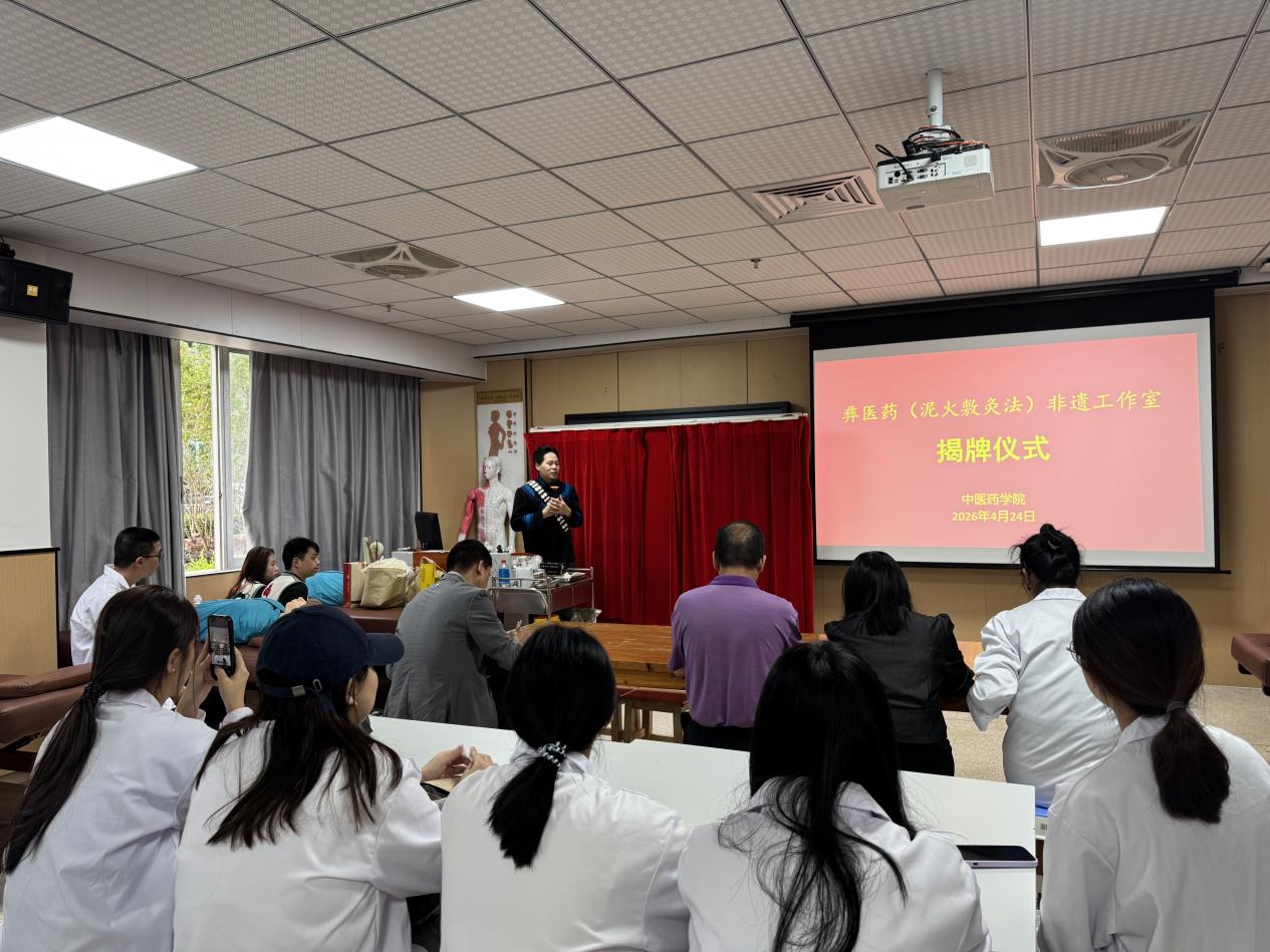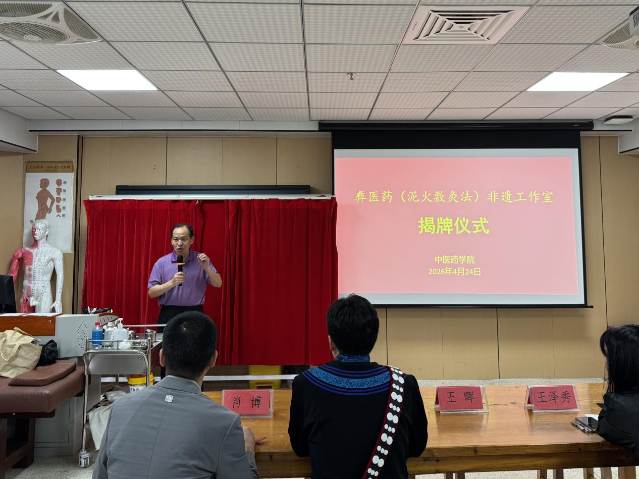 為推動(dòng)非物質(zhì)文化遺產(chǎn)融入校園教育,傳承與弘揚(yáng)彝醫(yī)藥傳統(tǒng)技藝,2026年4月24日上午9:30,我校彝醫(yī)藥(泥火敷灸法)非遺工作室揭牌儀式在西2教學(xué)樓104室順利舉行。本次活動(dòng)以“傳承非遺文脈,賦能文化新生”為主題,中醫(yī)藥學(xué)院院長(zhǎng)王暉、副院長(zhǎng)王澤秀、活態(tài)非遺彝醫(yī)傳承人文東、遵義市風(fēng)濕痹癥研究所副所長(zhǎng)肖博及師生代表共同參與。